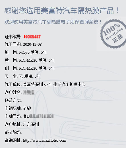 美富特擁有完善的汽車膜質保體系,產(chǎn)品一經(jīng)授權經(jīng)銷商和4S店安裝就能獲得不同年限質保,保證質保期內產(chǎn)品無破損、