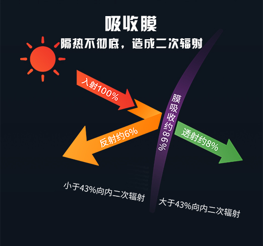 是在膜上添加了吸熱劑,猶如一塊海綿吸收約86%的熱量,吸熱飽和后,溫度飆升,造成第二次輻射。熱量不斷傳向車內,此時您愛車的空調負荷不但沒有減輕,反而是超負荷運作,油耗飆高。